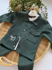 Set, yumuşak ve nefes alabilen kumaşlardan üretilmiştir. Tişört, modern diagonal desenleriyle dikkat çekerken, gömlek ve pantolon kombinasyonu, çocukların hareket özgürlüğünü kısıtlamadan şıklık sağlar.